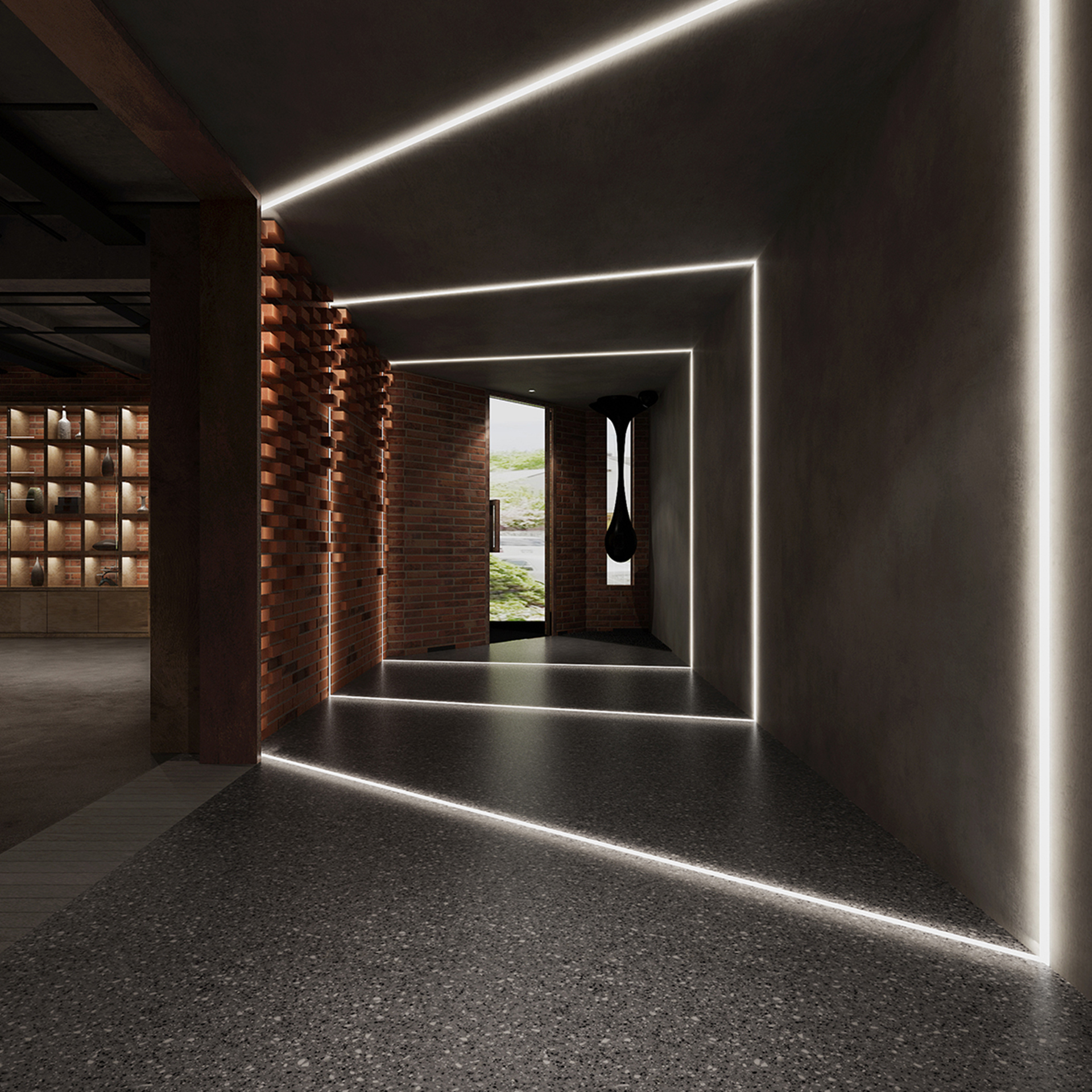酒吧寬闊的通道讓吧臺、酒墻、沙發(fā)區(qū)分散開來,讓在不同區(qū)域活動的人在碩大的空間中找到自己的歸屬。光在整個空間中扮演著各種角色,有些讓人沉靜,有些讓人興奮。石墻、鵝卵石,最純粹的建筑元素在精心的排布和設(shè)計中發(fā)揮了其美的特點。墻面構(gòu)筑元素采用了泡沫紅陶瓷用來模擬紅磚材料,防水防火?;璋档沫h(huán)境下,人們才真正可以與世隔絕,享受自由。