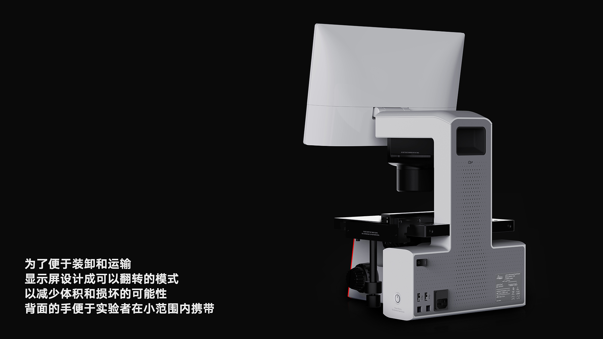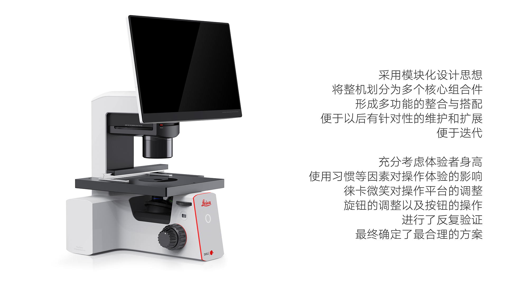 該顯微鏡采用模塊化設(shè)計(jì)思路,將整機(jī)分類成多個(gè)核心組合部件,形成多功能的整合與搭配。方便后期進(jìn)行針對性維修和拓展,便于迭代。充分考慮實(shí)驗(yàn)者身高,使用習(xí)慣等因素對操作體驗(yàn)的影響,徠卡SMILE對操作臺(tái)的調(diào)節(jié),旋鈕的調(diào)節(jié),按鈕的操作等進(jìn)行反復(fù)的驗(yàn)證,最終確認(rèn)最合理的方案。產(chǎn)品為方便搬運(yùn)和運(yùn)輸,將顯示屏設(shè)計(jì)成可翻折的模式,減小體積,減小損傷的可能性。背后的摳手方便實(shí)驗(yàn)人員在小范圍內(nèi)搬運(yùn)。